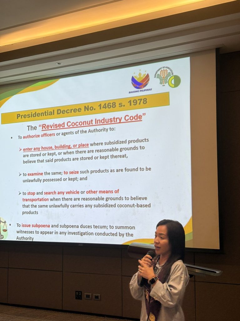 Thessalee Mae E. Posadas of PCA Region XI addressed the controversial dual-clearance requirement for coconut fiber exports, revealing ongoing harmonization efforts with PHILFIDA. Meanwhile, Mikhail D. Young of the FDA discussed common pitfalls in securing Licenses to Operate (LTO) and emphasized the need for better applicant preparation.